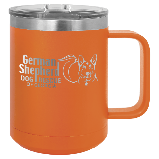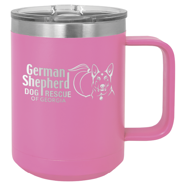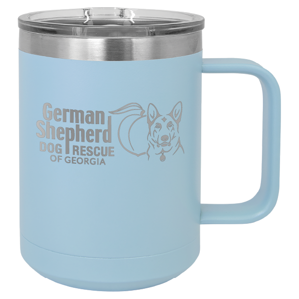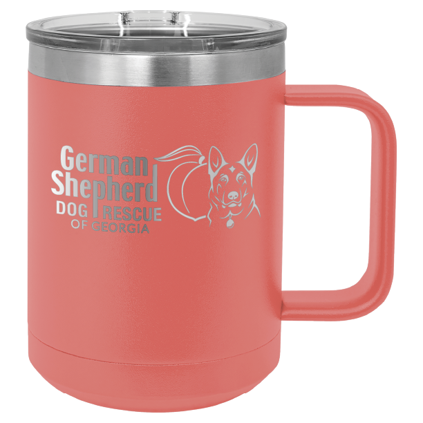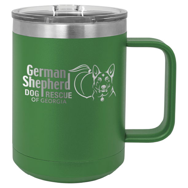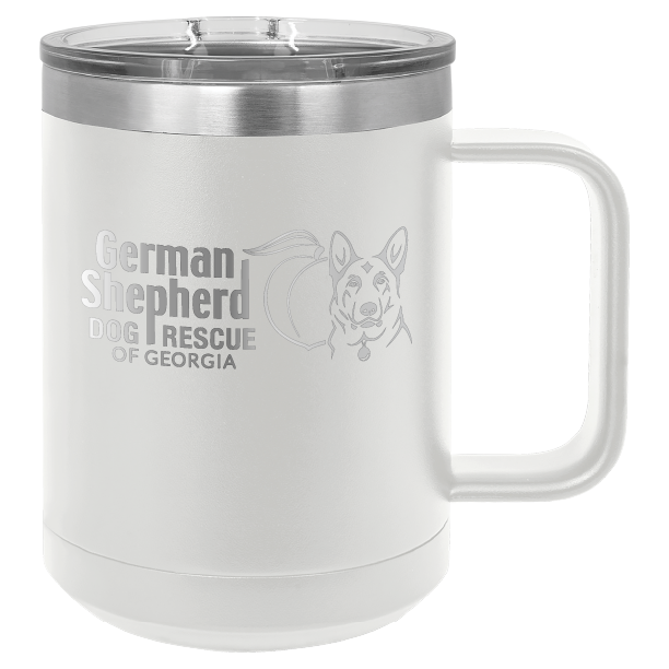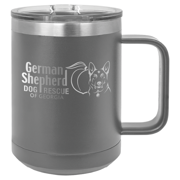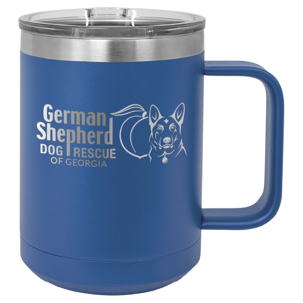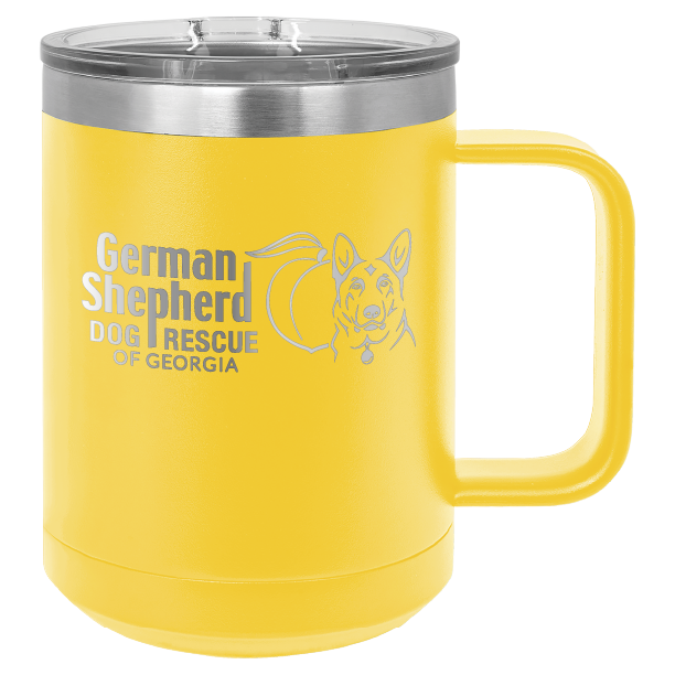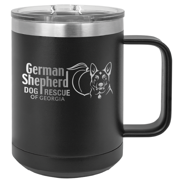 Keep your drinks hot or cold for longer with our 15 oz. German Shepherd Dog Rescue of Georgia coffee cup! Buy one with your name, or your pet's name to honor his or her memory. Get yours now and make a difference!